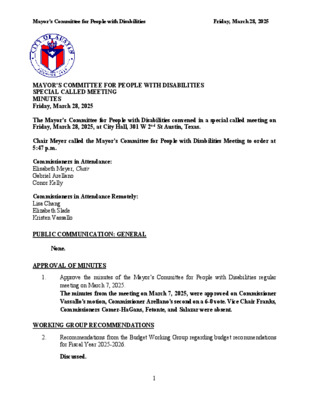 Mayor’s Committee for People with Disabilities Minutes July 11, 2025 MAYOR’S COMMITTEE FOR PEOPLE WITH DISABILITIES REGULAR CALLED MEETING MINUTES Friday, July 11, 2025 The Mayor’s Committee for People with Disabilities convened in a regular meeting on Friday, July 11, 2025, at City Hall, 301 W 2nd St. Room 1101, Austin, Texas. Chair Kelly called the Mayor’s Committee on People with Disabilities Meeting to order at 5:36 p.m. Commissioners in Attendance: Conor Kelly, Chair Gabriel Arellano Commissioners in Attendance Remotely: Lisa Chang DeLawnia Comer-HaGans Lynn Murphy Elizabeth Slade PUBLIC COMMUNICATION: GENERAL Zenobia Joseph – Public transportation systems in Austin Morgan Clift – Great Strides ABA APPROVAL OF MINUTES 1. Approve the minutes of the Mayor’s Committee for People with Disabilities regular called meeting on June 13, 2025. The minutes from the meeting of June 13, 2025 were approved on Chair Kelly’s motion, Commissioner Chang’s second on an 6-0 vote. Vice Chair Meyer and Commissioners Diaz, Fetonte, Franks, and Vassallo were absent. STAFF BRIEFINGS 1 Mayor’s Committee for People with Disabilities Minutes July 11, 2025 2. Staff briefing regarding upcoming events from the Office of Police Oversight. Briefing provided by Cooper Thompson, Community Engagement Specialist, and Sara Peralta, Public Information and Marketing Program Manager, Office of Police Oversight. Briefing provided by Cooper Thompson, Community Engagement Specialist, and Sara Peralta, Public Information and Marketing Program Manager, Office of Police Oversight. DISCUSSION ITEMS 3. 4. 5. 6. 7. Presentation regarding instant ASL Access by Joseph Tsai, CONVO. Presentation regarding instant ASL access from Convo Access provided by Joseph Tsai. Update from the Joint Inclusion Committee (JIC) representative on the work of the committee from the June 2025 meeting. Update provided by Commissioner Chang. Discussion of disability access at Blues on the Green. Discussed. Update regarding the most recent meeting of the Austin Transit Partnership Community Advisory Committee. Postponed to the next regular meeting with no objection. Discussion regarding the Texas Department of Transportation Civil Rights Division’s 35th Anniversary of the Americans with Disabilities Act. Withdrawn. WORKING GROUP UPDATES 8. Update from the October 2025 Disability Event Working Group on their most recent meetings and accomplishments. Update provided by Commissioner Arellano. DISCUSSION AND ACTION ITEMS 9. 10. Formation of a working group regarding the expansion of therapeutic recreation program access and the creation of budget recommendations for therapeutic recreation programs within the Austin Parks and Recreation Department. This item was postponed on Chair Kelly’s …