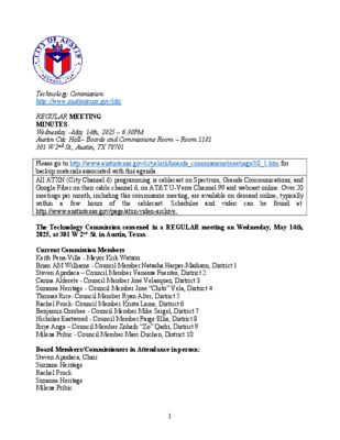 Technology Commission http://www.austintexas.gov/cttc REGULAR MEETING MINUTES Wednesday –August 13th, 2025 – 6:30PM Permitting and Development Center– Training Room – Room 1402 6310 Wilhelmina Delco Dr, Austin, TX 78752 Please go to http://www.austintexas.gov/cityclerk/boards_commissions/meetings/10_1.htm for backup materials associated with this agenda. All ATXN (City Channel 6) programming is cablecast on Spectrum, Grande Communications, and Google Fiber on their cable channel 6, on AT&T U-Verse Channel 99 and webcast online. Over 20 meetings per month, including this commission meeting, are available on demand online, typically within a found at: http://www.austintexas.gov/page/atxn-video-archive. the cablecast. Schedules and video can be few hours of The Technology Commission convened in a REGULAR meeting on Wednesday, August 13th, 2025, at 6310 Wilhemina Delco Dr, Austin, Texas. Current Commission Members Keith Pena-Villa ‐ Mayor Kirk Watson Brian AM Williams ‐ Council Member Natasha Harper‐Madison, District 1 Steven Apodaca – Council Member Vanessa Fuentes, District 2 Carina Alderete ‐ Council Member José Velasquez, District 3 Suzanne Heritage ‐ Council Member José “Chito” Vela, District 4 Thomas Rice‐ Council Member Ryan Alter, District 5 Rachel Frock‐ Council Member Krista Laine, District 6 Benjamin Combee ‐ Council Member Mike Seigel, District 7 Nicholas Eastwood ‐ Council Member Paige Ellis, District 8 Ibiye Anga – Council Member Zohaib “Zo” Qadri, District 9 Milena Pribic ‐ Council Member Marc Duchen, District 10 Board Members/Commissioners in Attendance in person: Steven Apodaca, Chair Milena Pribic Benjamin Combee Board Members/Commissioners in Attendance Remotely: Rachel Frock 1 Ibiye Anga Carina Alderete, Vice-Chair Brian AM Williams Board Members/Commissioners Not in Attendance: Thomas Rice Nicolas Eastwood Keith Pena-Villa Suzanne Heritage CALL TO ORDER Chair Apodaca called the Community Technology and Telecommunications Meeting to order at 6:36 p.m. PUBLIC COMMUNICATION: GENERAL The first ten speakers who register to speak no later than noon on the day before the meeting will be allowed a three-minute allotment to address their concerns regarding items not posted on the agenda. There were no members of the public that signed up to speak. APPROVAL OF MINUTES 1. Approve the minutes of the Technology Commission regular meeting on July 9th, 2025. Motion to approve the meeting minutes was made by Commissioner Combee and seconded by Vice Chair Alderete. The minutes were approved on a vote of 6-0. DISCUSSION ITEMS 2. Hold a public hearing to solicit feedback from the public and community stakeholders regarding the usefulness and relevance of the Technology Commission stated purposes and duties and its …